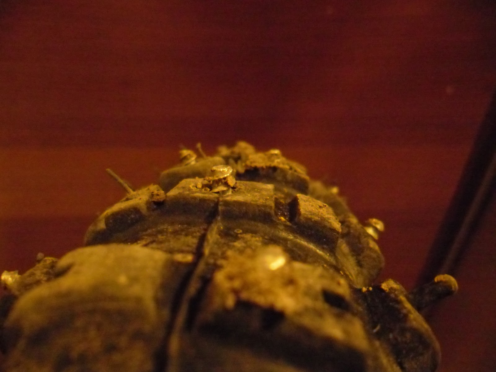 В принципе, чего еще ожидать в такую бесснежную зиму? Если бы был снег, все было бы нормально. Но я думаю, когда саморезы будут выступать лишь на 0.2-0.3 мм, процесс стирания замедлится. Когда они сотрутся окончательно, я планирую выкрутить их и вкрутить новые. Думаю вкрутить побольше, т.к. чем больше саморезов (а весят они не много), тем меньше будет их износ. На переднем же колесе саморезы как торчали на 2-2.5мм, так и торчат. Не стерлись даже центральные. Это очень хорошо, учитывая, что именно переднее колесо отвечает за контроль на дороге.
