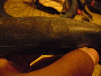 Недавно, чтобы ехать было легче, я решил накачать колеса посильнее. Собственно, накачал я их не сильно, а так, как обычно все накачивают колеса летом. Поехал по делам, а на обратном пути у меня спустило заднее колесо. Дома я вытащил покрышку, обнаружил две странные дырочки на камере, при том, что камера-подкладка была цела. Я не стал запариваться и просто заклеил камеру. На следующий день я поехал в ночную покатушку и в пути у меня спустило переднее колесо. В голову начали закрадываться мысли, что это дело рук саморезов, а точнее, шляпок саморезов, которые могли повредить камеру. Разобрал колесо, вытащил камеру и точно — вся камера была в заметных отметинах от шляпок саморезов, а дырка находилась ровно по краю отметины. Короче говоря, было точно видно, что причиной повреждения камеры была шляпка самореза. Чтобы было понятнее, выкладываю фото: